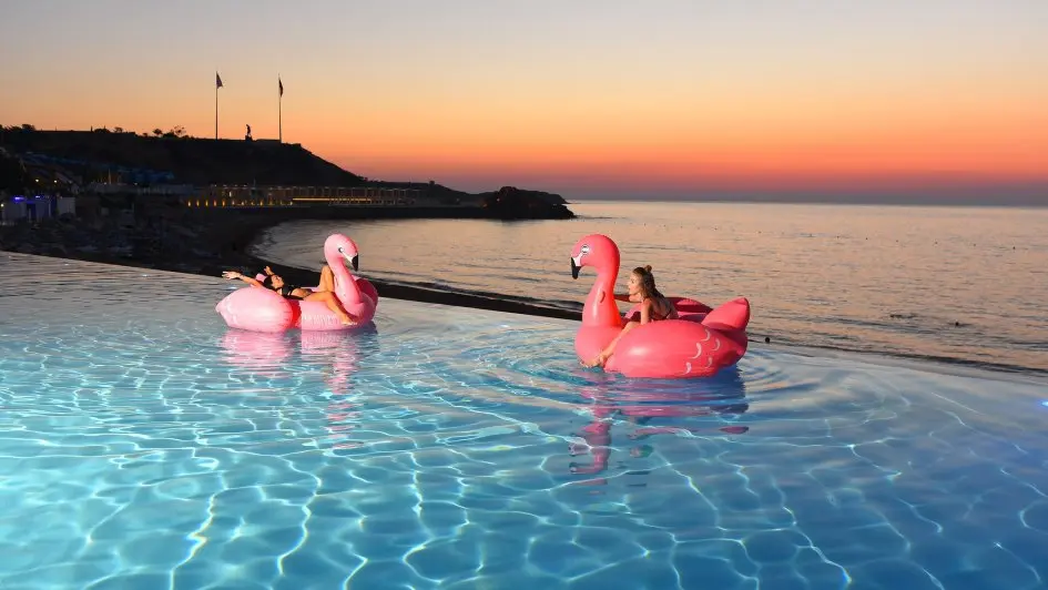 100.000 metrekarelik geniş bir alana yayılan tesis, farklı konaklama seçenekleri sunmaktadır; otel odaları, VIP odalar ve villalar arasından tercih yapılabilmektedir. Suyla ilgili eğlenceyi doruklarda yaşamak isteyen misafirler için tesiste 2 açık havuz, 5 kayma havuzlu ve 24 kaydıraklı aquapark (10.00-12.00 ve 14.00-17.00 saatleri arasında hizmet vermektedir), 17 yaş üzeri için sezonda hizmet veren sonsuzluk havuzu, ısıtmalı kapalı havuz, açık ve kapalı çocuk havuzları bulunmaktadır.