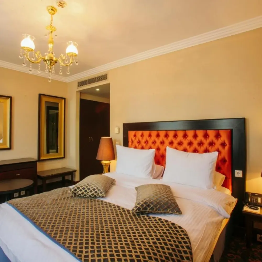 Intourist'in odaları parlak renkli ve ahşap mobilyalı klasik iç tasarıma sahiptir. Tüm odalarda küvetli özel banyo ve balkon vardır. TV'lerde uydu kanalları izlenebilir.